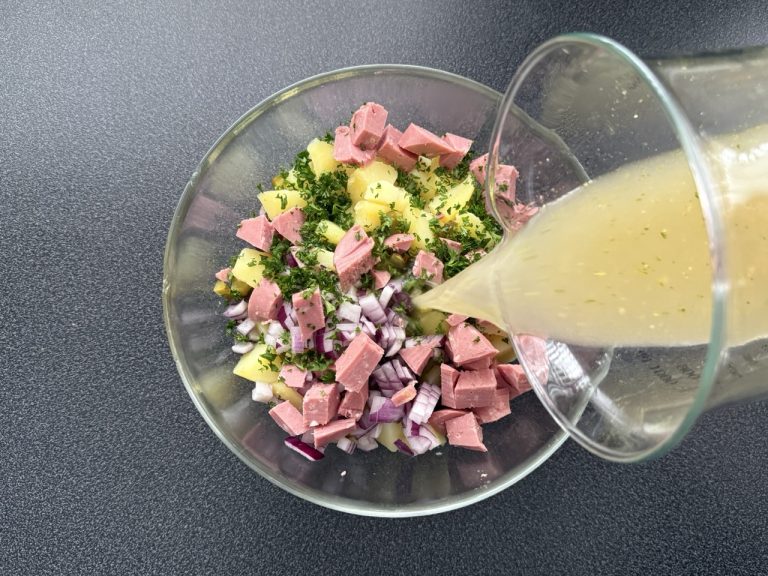 de aardappelen nemen de bouillon op, waardoor de salade zacht, romig en smaakvol wordt precies zoals je hem in Duitsland eet.