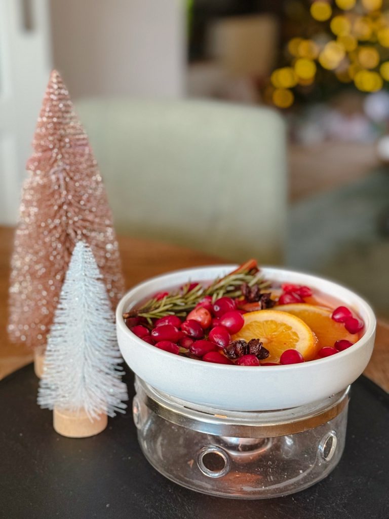 Een pannetje met water, fruit en specerijen dat je verwarmt om een natuurlijke kerstgeur in huis te verspreiden.
